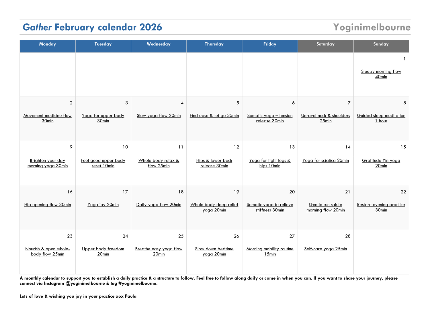 These monthly calendars have been created to support you to establish and cultivate a daily practice. A new practice calendar will be released each month with a particular focus or theme. Feel free to follow along daily or come in and out when you can.